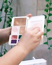 頬骨に沿ってブラウン系のチークを入れ、その上から目下に多めにハイライトを入れることで立体感を出します。